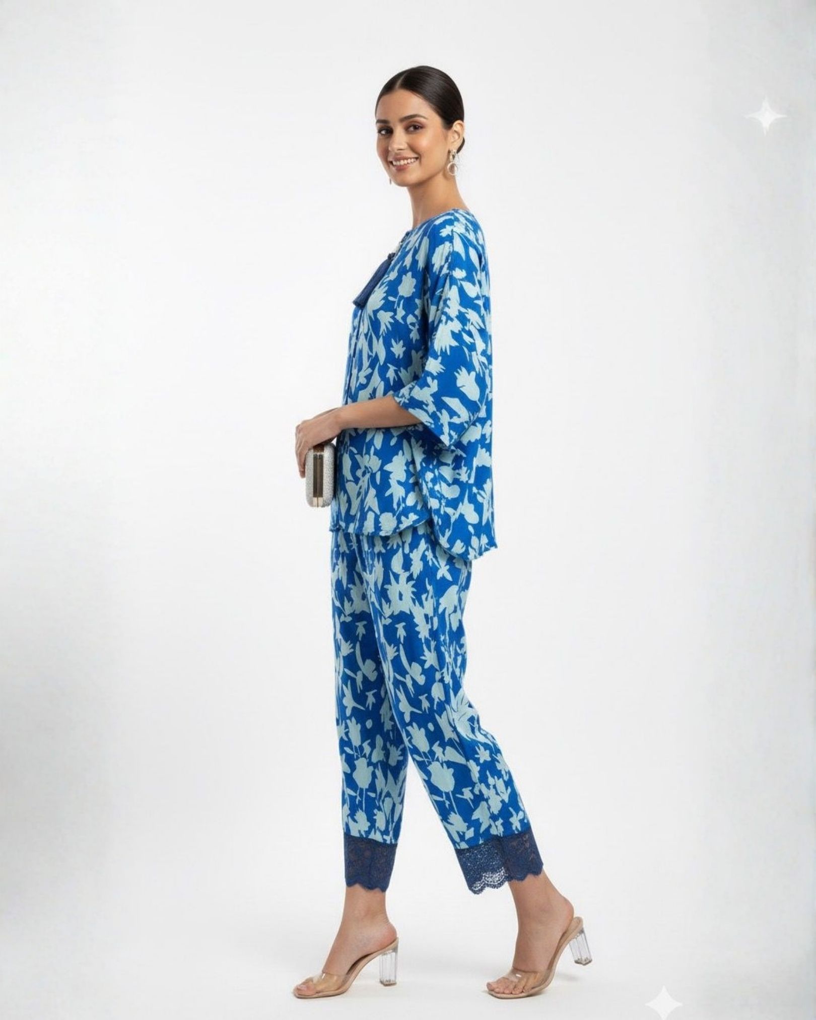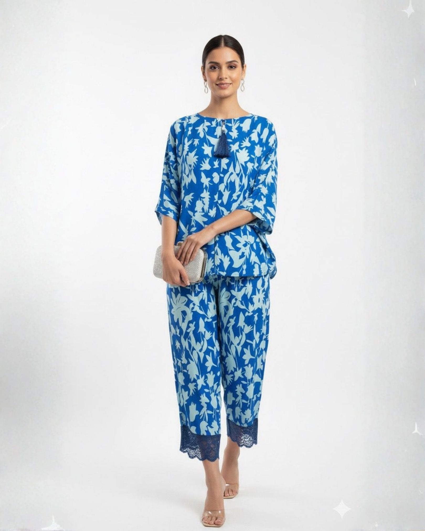 The vibrant blue base adorned with soft floral prints creates a perfect harmony of color and charm, while the tassel detailing at the neckline and lace-trimmed trousers add a playful, feminine touch. Whether it’s a casual brunch or an evening out, this co-ord set promises a look that’s both graceful and effortlessly stylish.