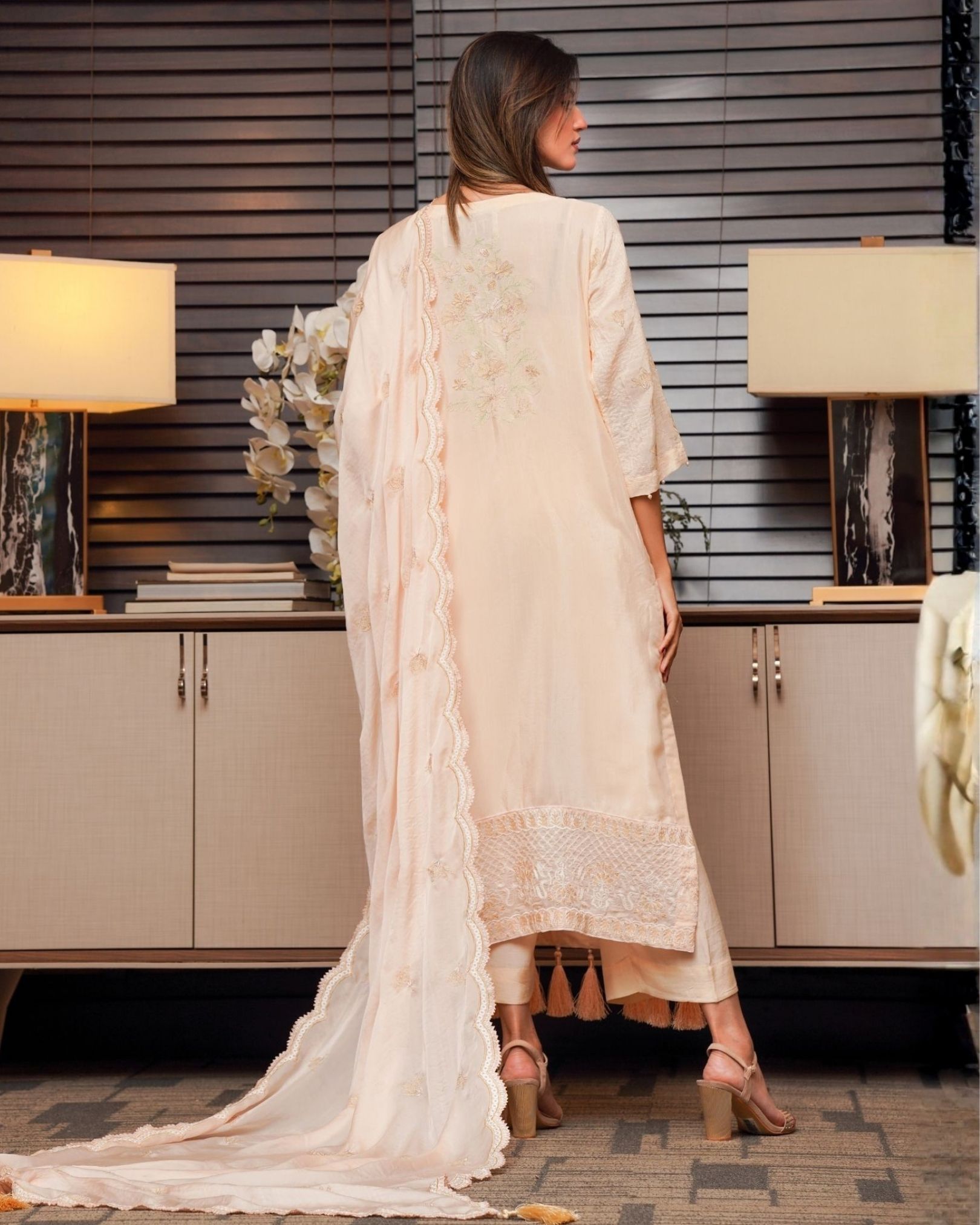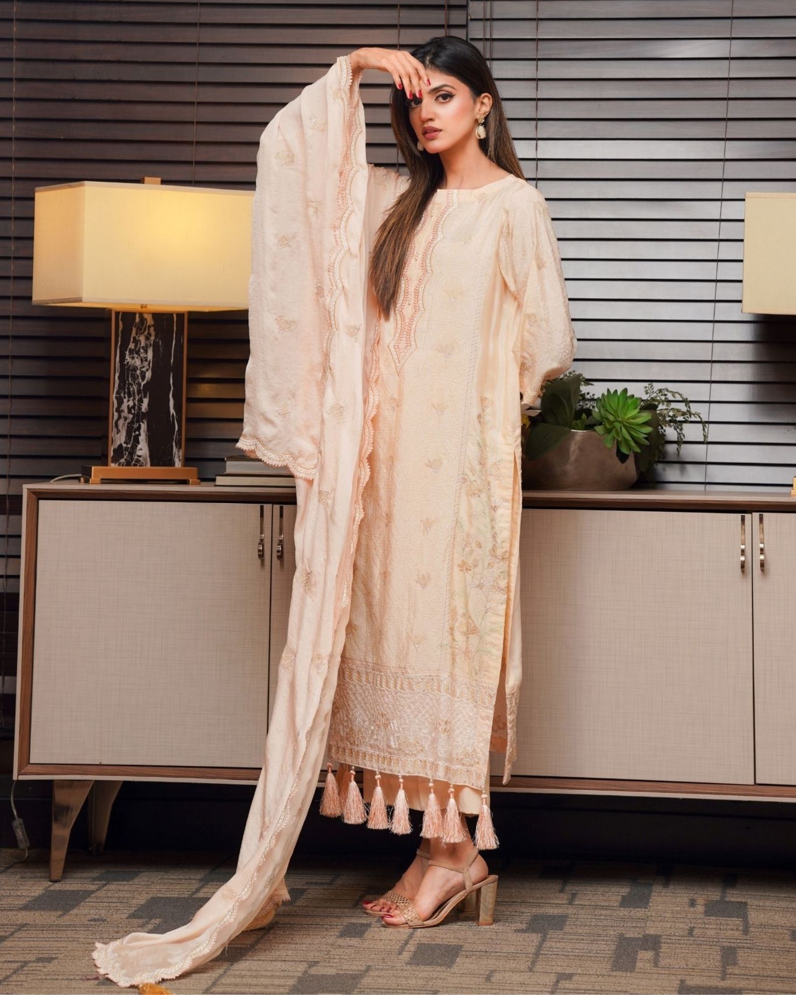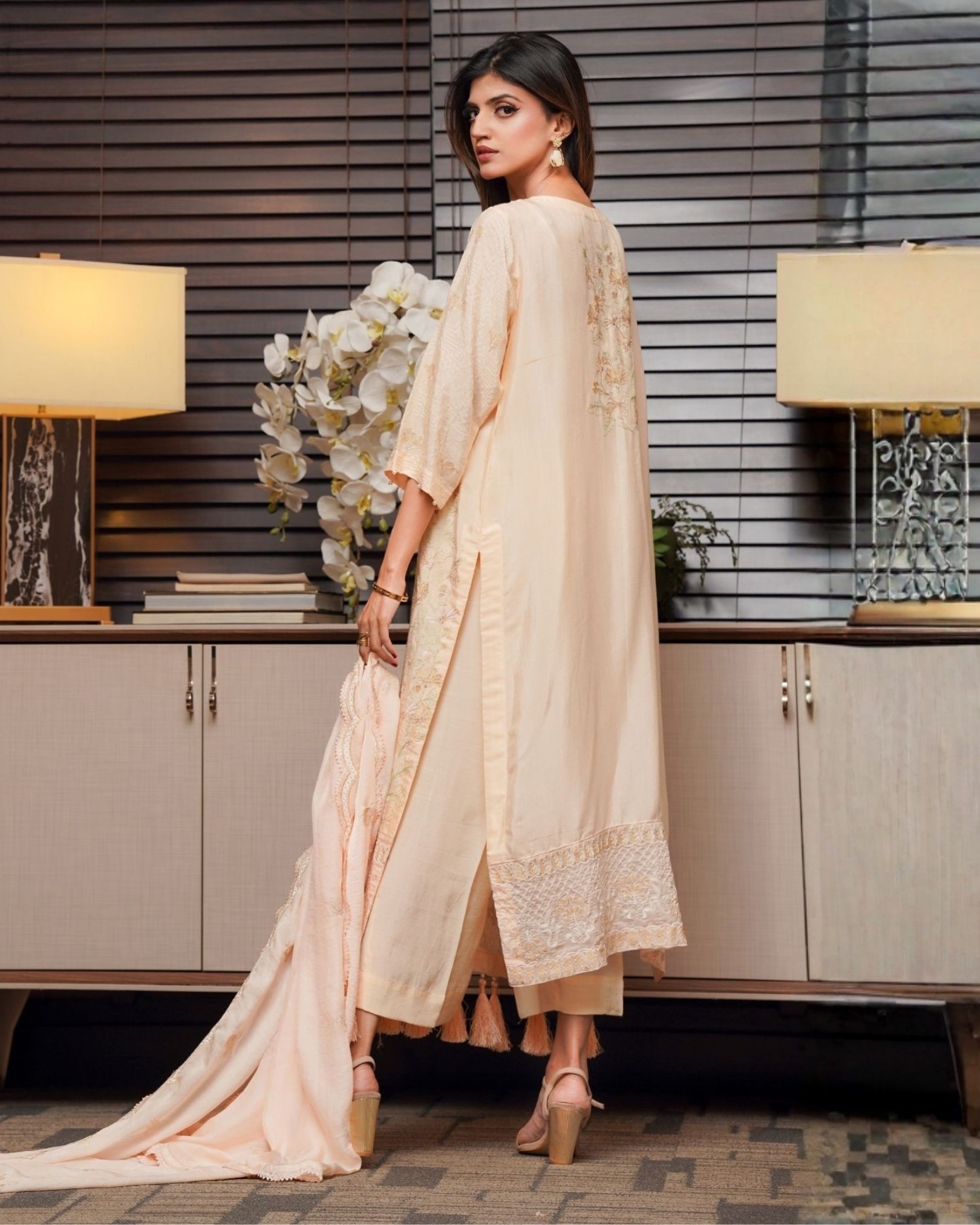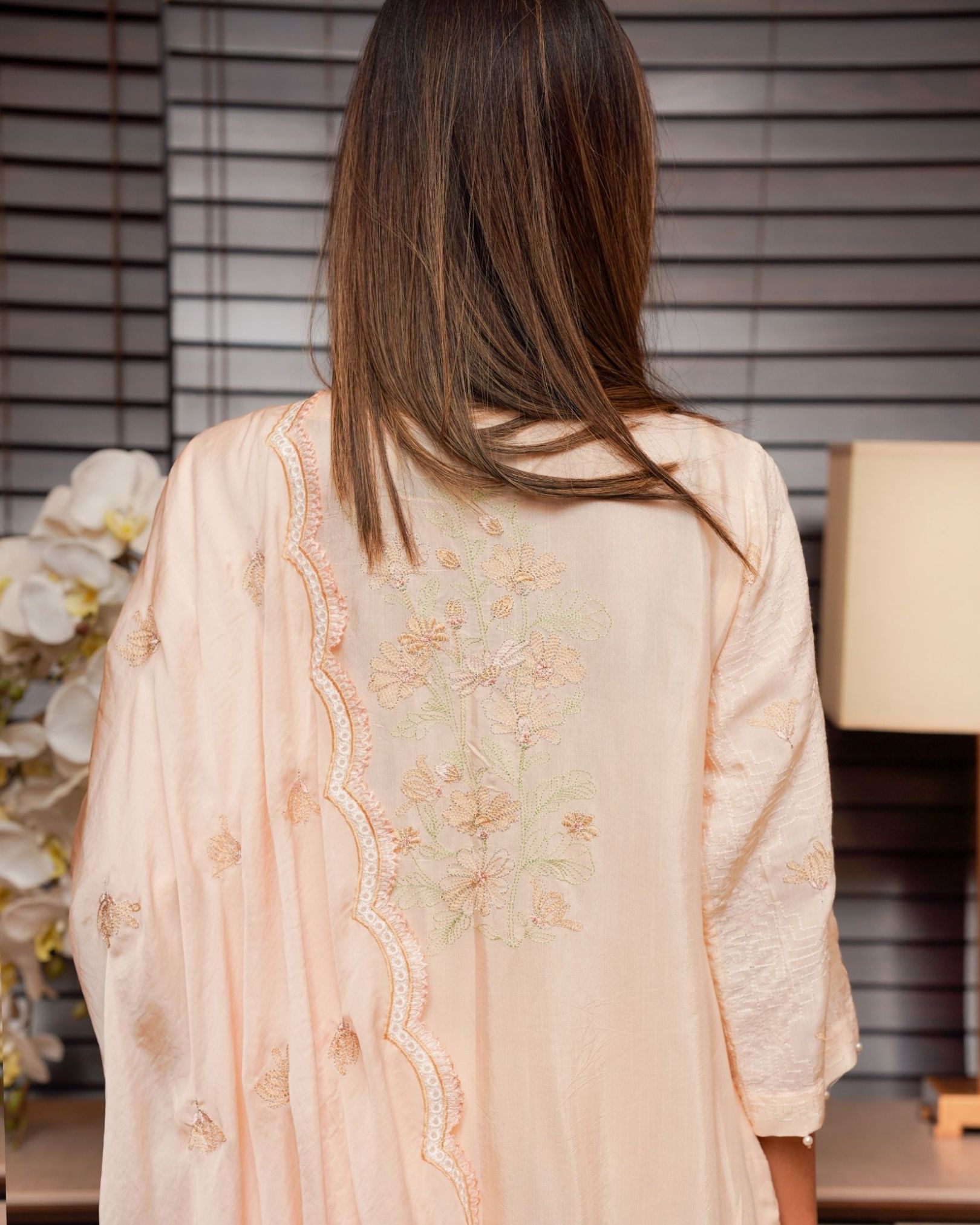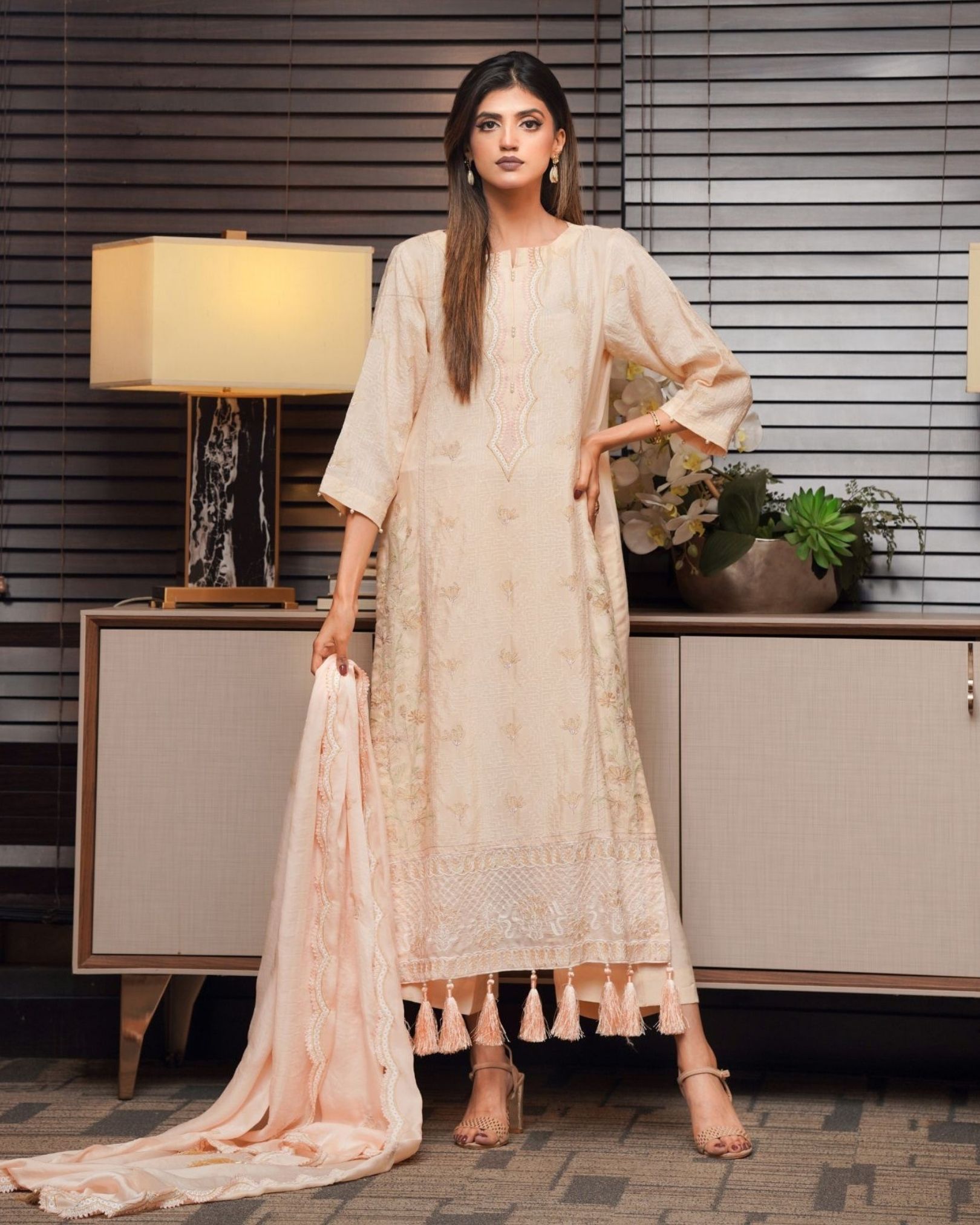 The soft skin-toned hue adds a touch of subtle glamour, enhanced by delicate embroidered detailing that brings an air of refinement to the look. Designed with a classic silhouette and elegant finishing, this outfit transitions effortlessly from day events to evening gatherings.