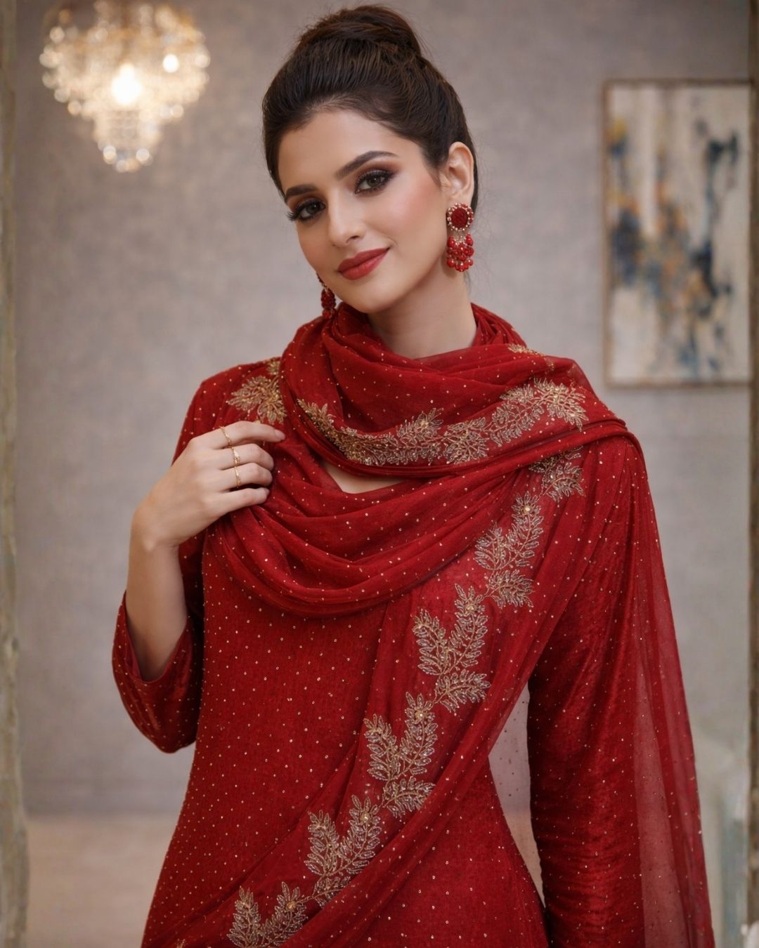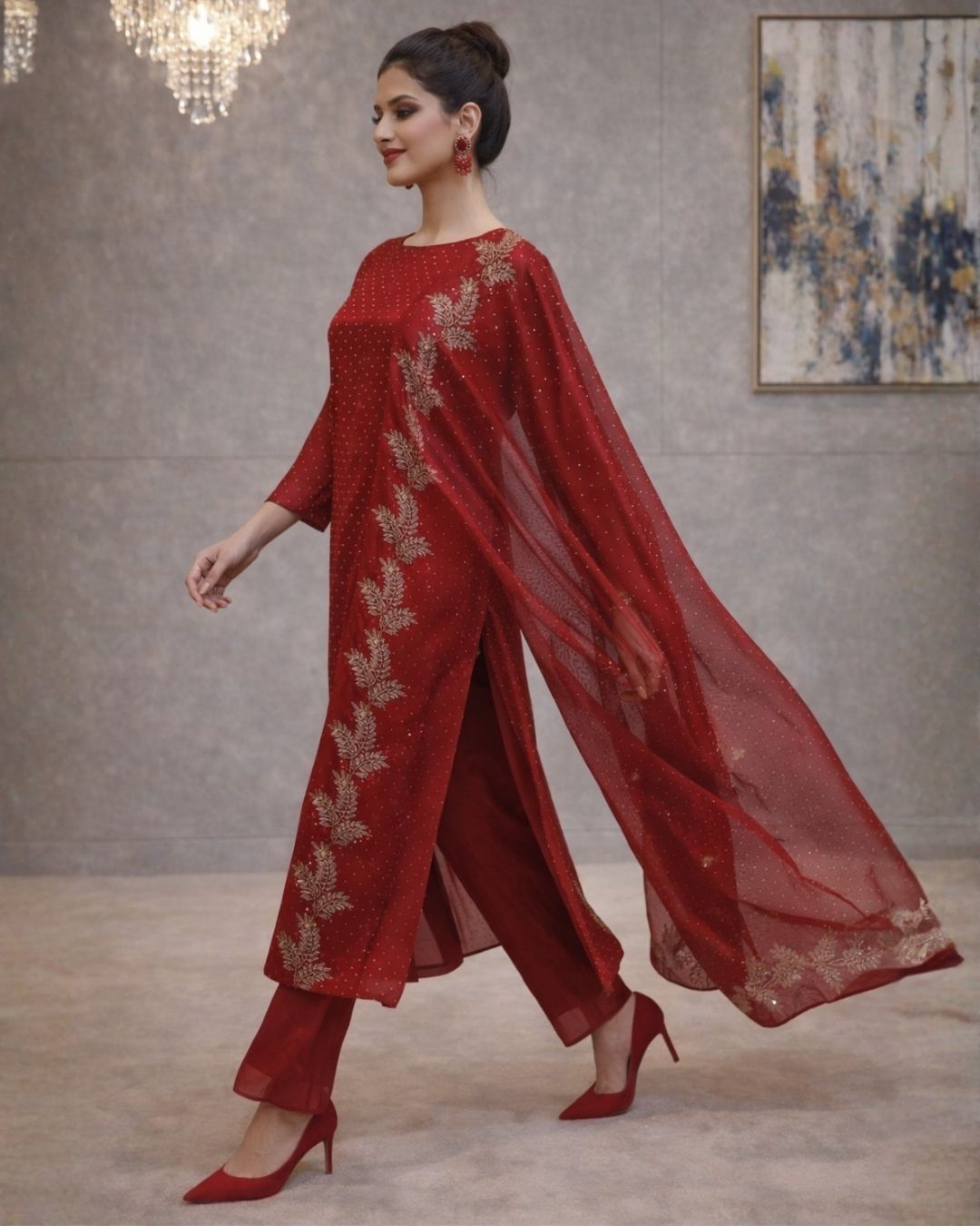 Make an unforgettable entrance in our Crimson Red 3-Piece Festive Pret, a statement ensemble designed for moments that deserve grandeur. Rendered in a rich, regal shade of deep red, this outfit embodies timeless festivity with a refined, contemporary finish.
