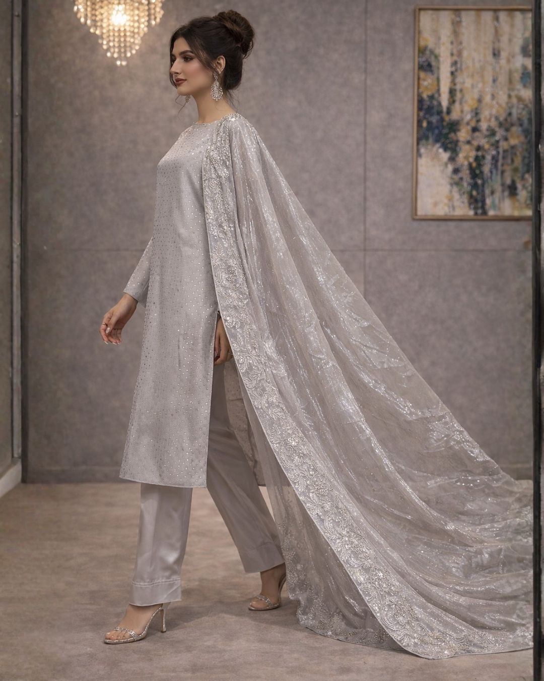 Step into timeless elegance with the Celestial Grey Festive Pret 3-Piece Ensemble, a refined statement designed for modern celebrations. Crafted for women who appreciate subtle glamour and sophisticated detailing, this outfit blends classic grace with contemporary charm, making it a perfect choice for festive gatherings, evening events, and intimate celebrations.
