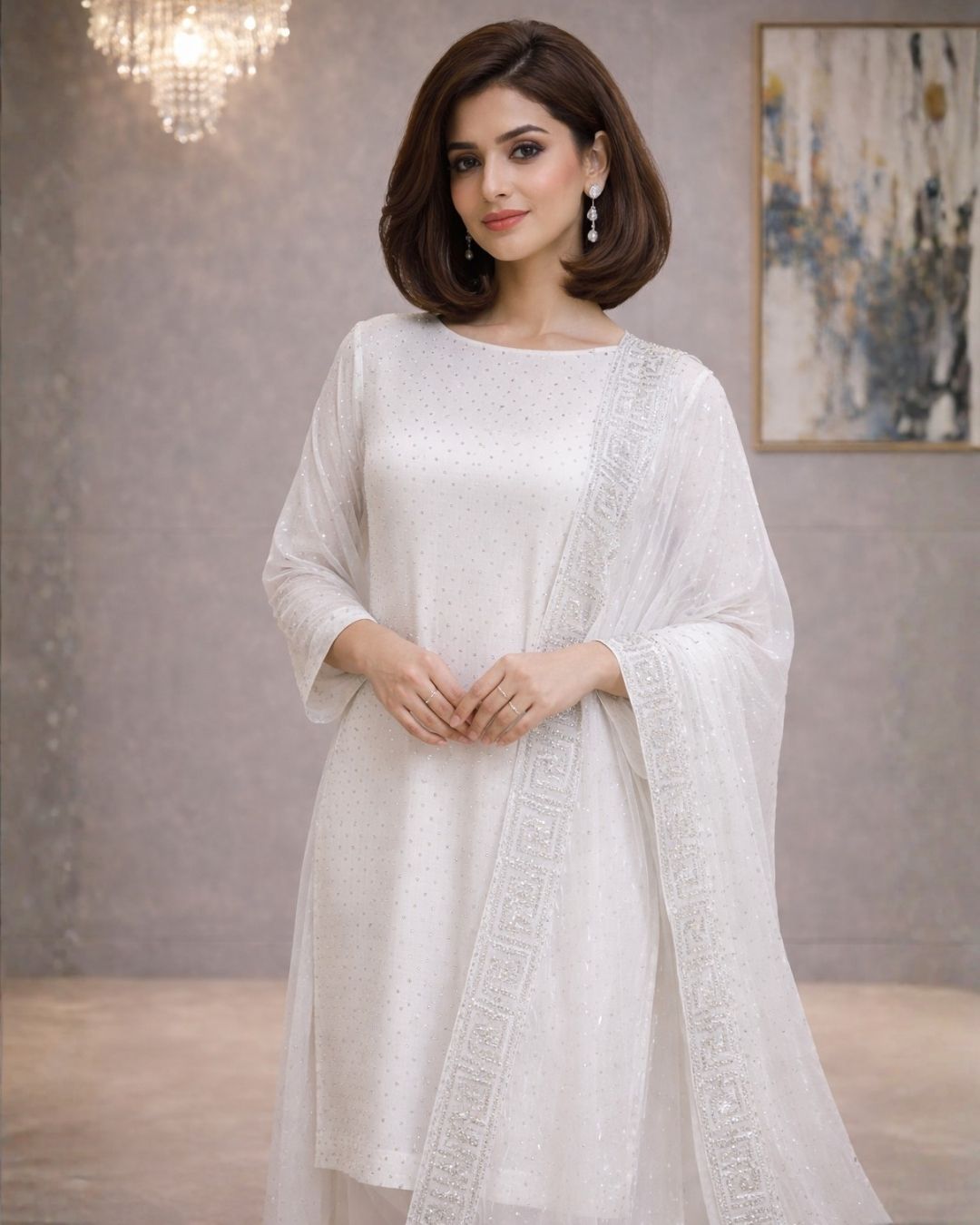 Delicate, luminous, and effortlessly graceful, the Ethereal White 3-Piece Festive Pret ensemble embodies timeless elegance with a modern festive charm. Designed in a pristine white hue, this outfit captures the essence of sophistication, making it a perfect choice for celebratory gatherings, festive evenings, and refined occasions.