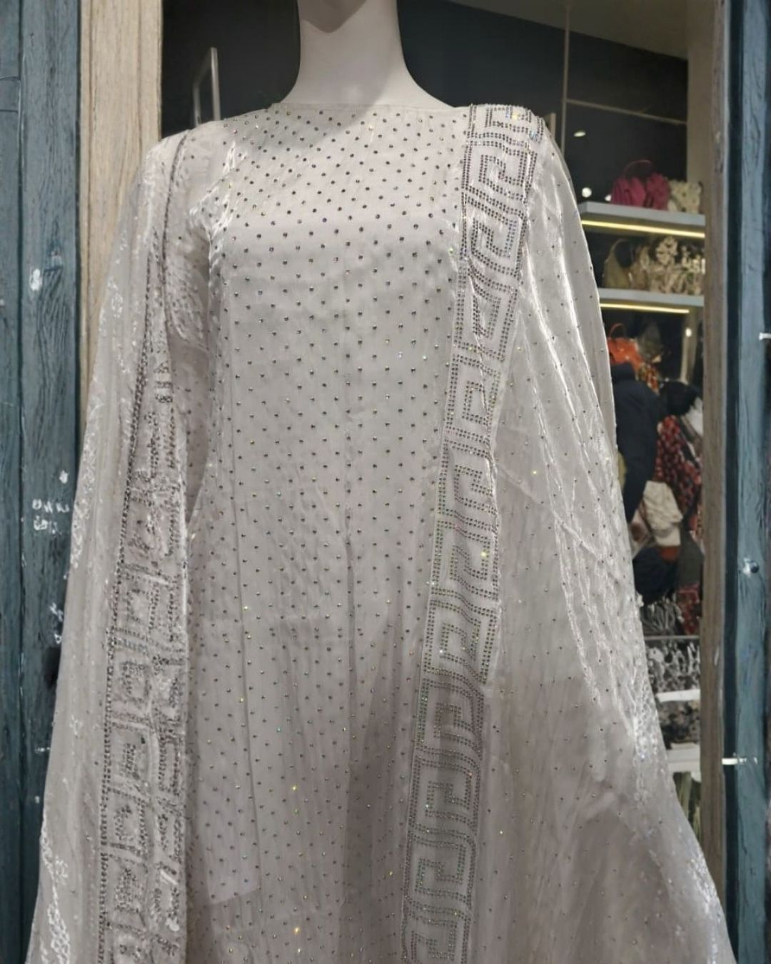 A highlight of the ensemble is the sheer, flowing dupatta, intricately detailed with a statement geometric embroidered border that adds depth and refined artistry. The dupatta drapes elegantly across the shoulder, creating a soft, ethereal movement that elevates the overall look. Its light, airy texture enhances the outfit’s dreamy appeal while complementing the shimmer detailing of the shirt.