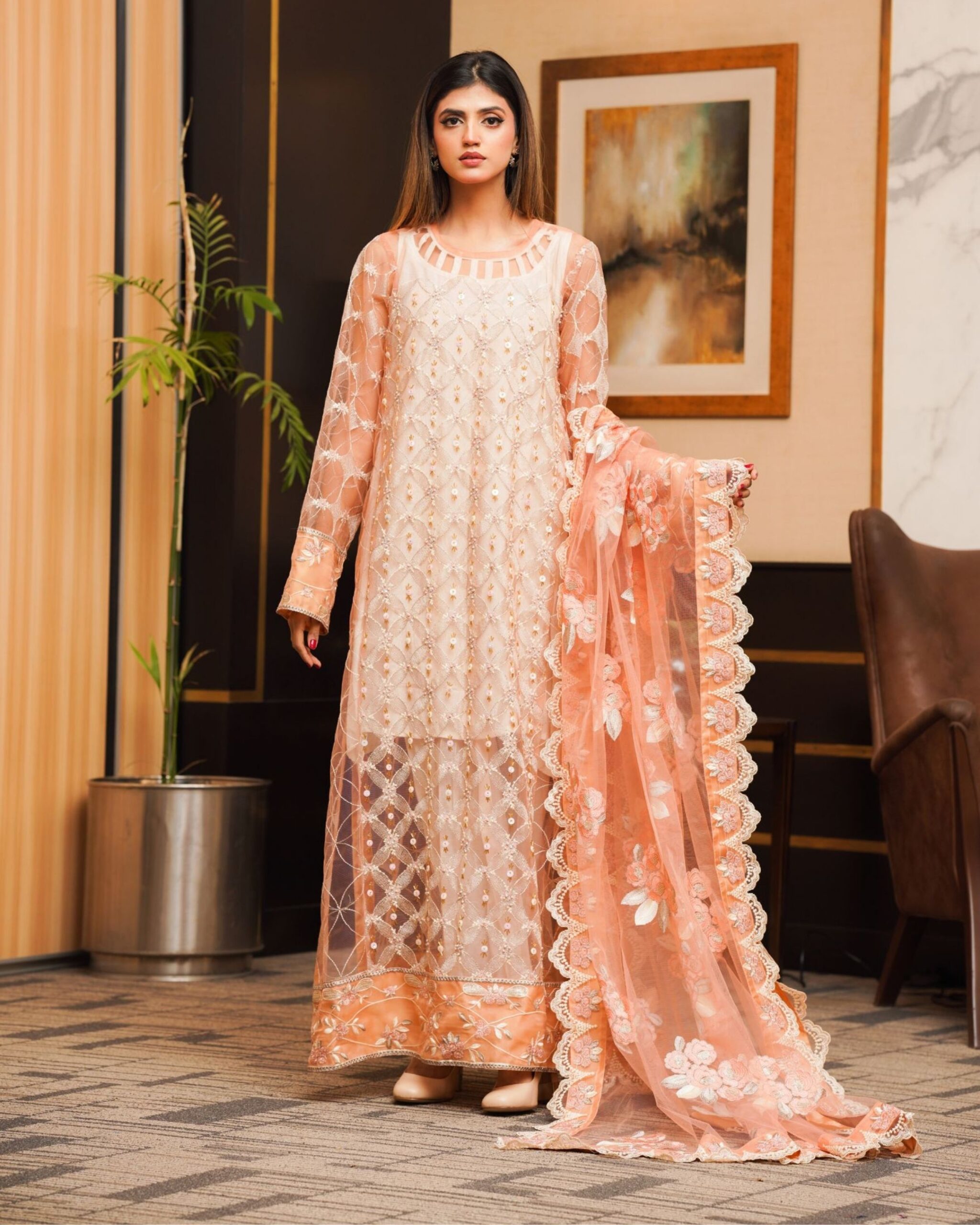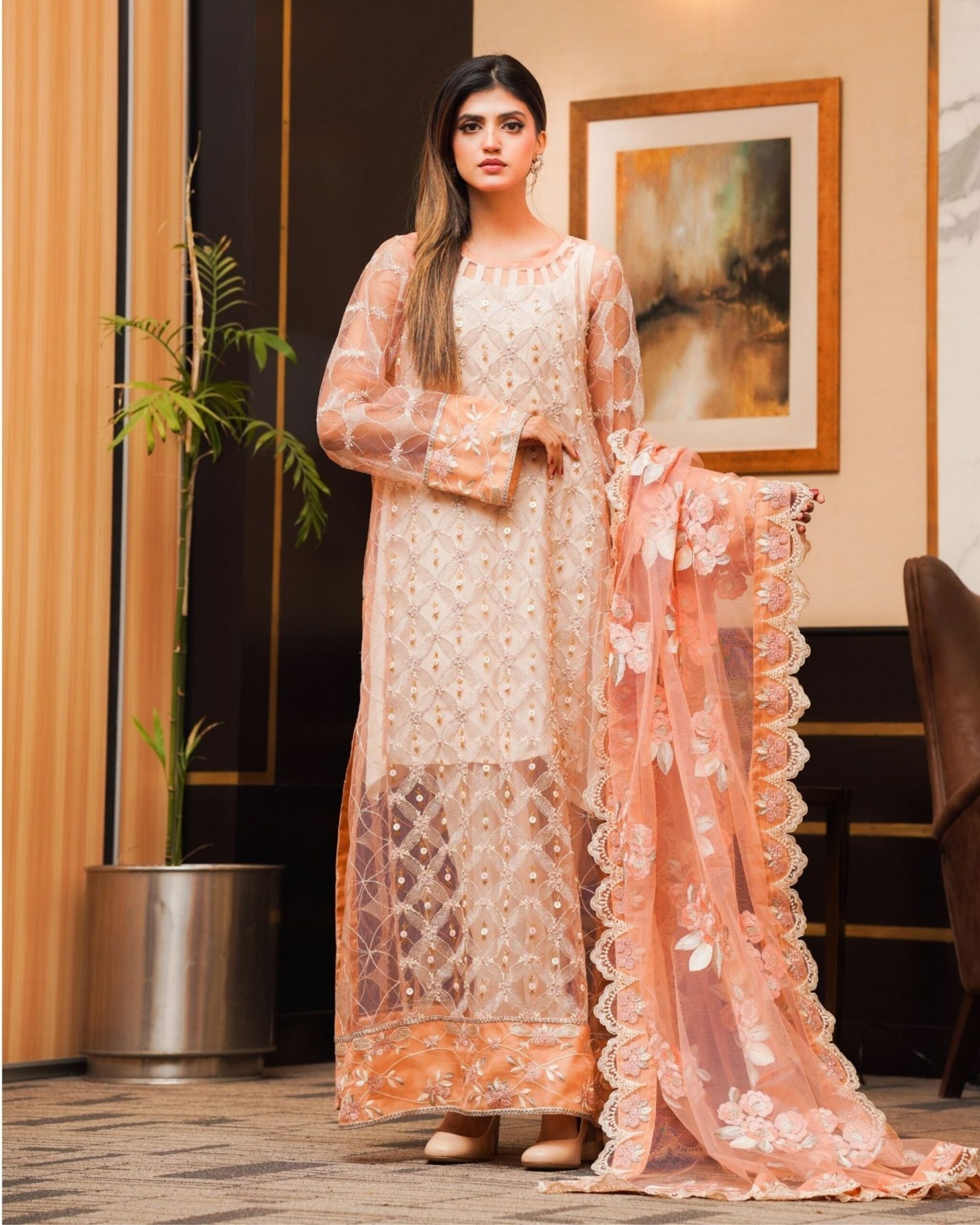 The organza dupatta, exquisitely detailed with 3D floral embroidery and scalloped edges, adds a touch of ethereal beauty flowing effortlessly like a dream.