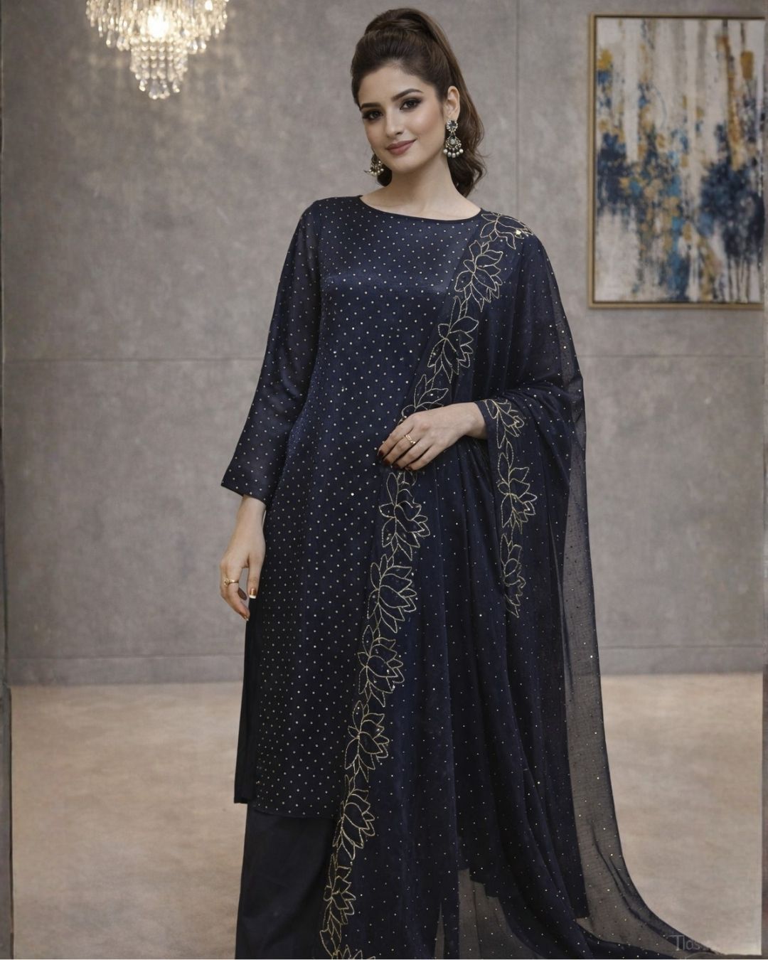 Elegant, timeless, and effortlessly festive, the Navy Blue Shimmer 3-Piece ensemble is designed to bring sophistication to your celebratory wardrobe. Crafted in a deep navy blue hue, this outfit beautifully balances minimal elegance with subtle festive sparkle, making it a perfect choice for intimate gatherings, festive dinners, and evening occasions.