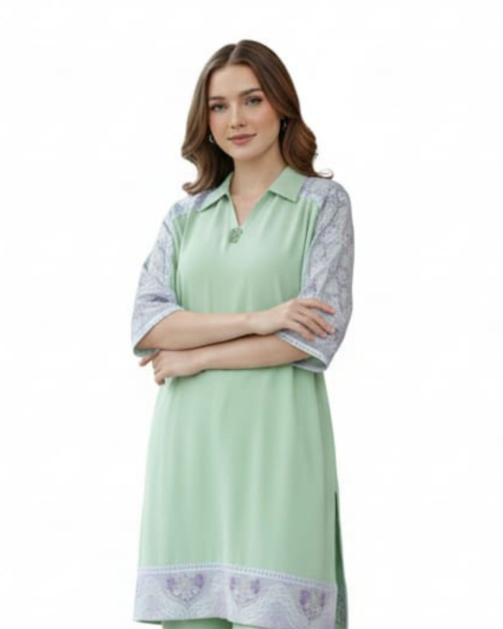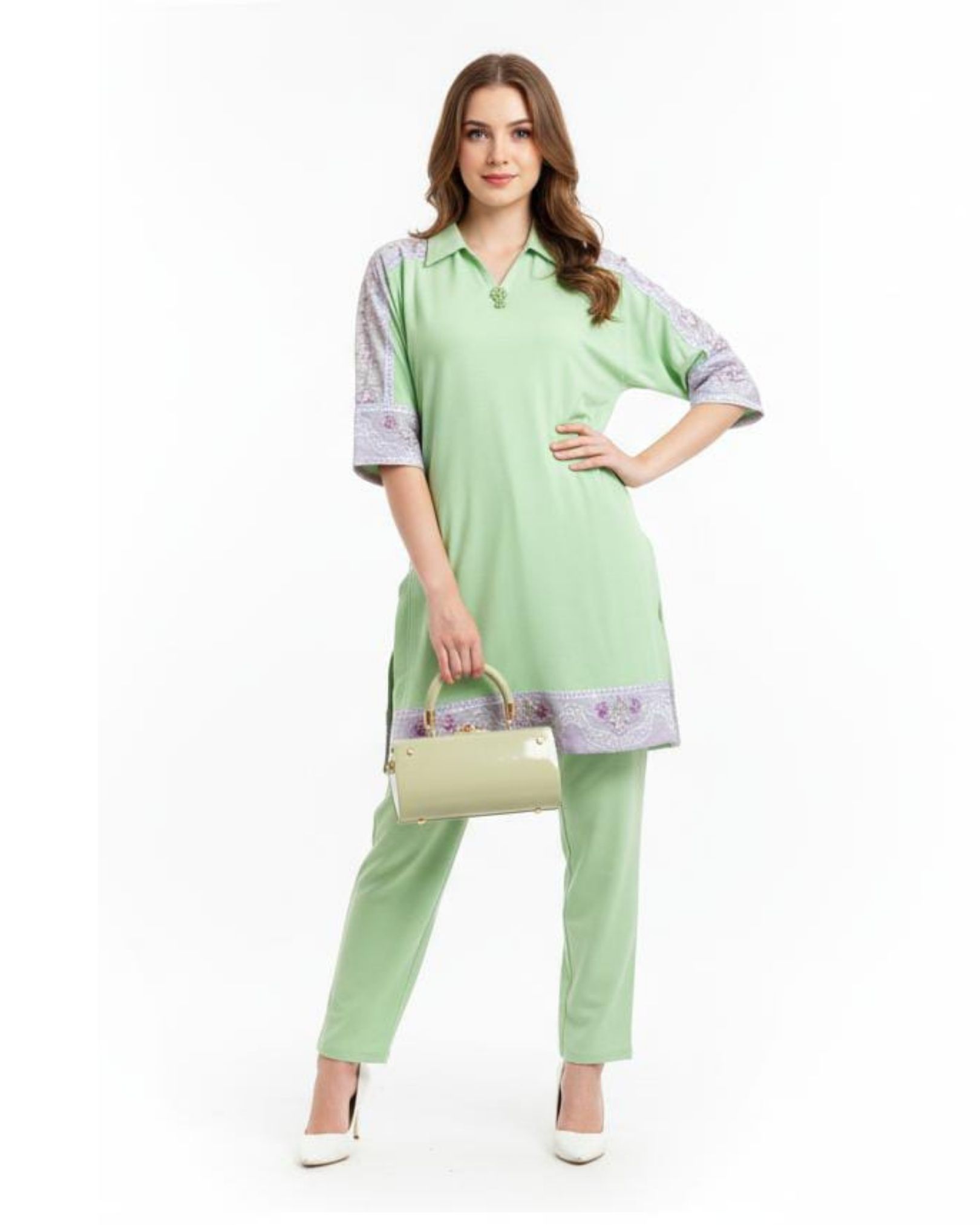 The soothing green tone exudes freshness and charm, while the intricate embroidery on the sleeves and hemline adds a subtle hint of luxury. Paired with tailored straight pants, this ensemble creates a balanced blend of modern style and classic allure.
