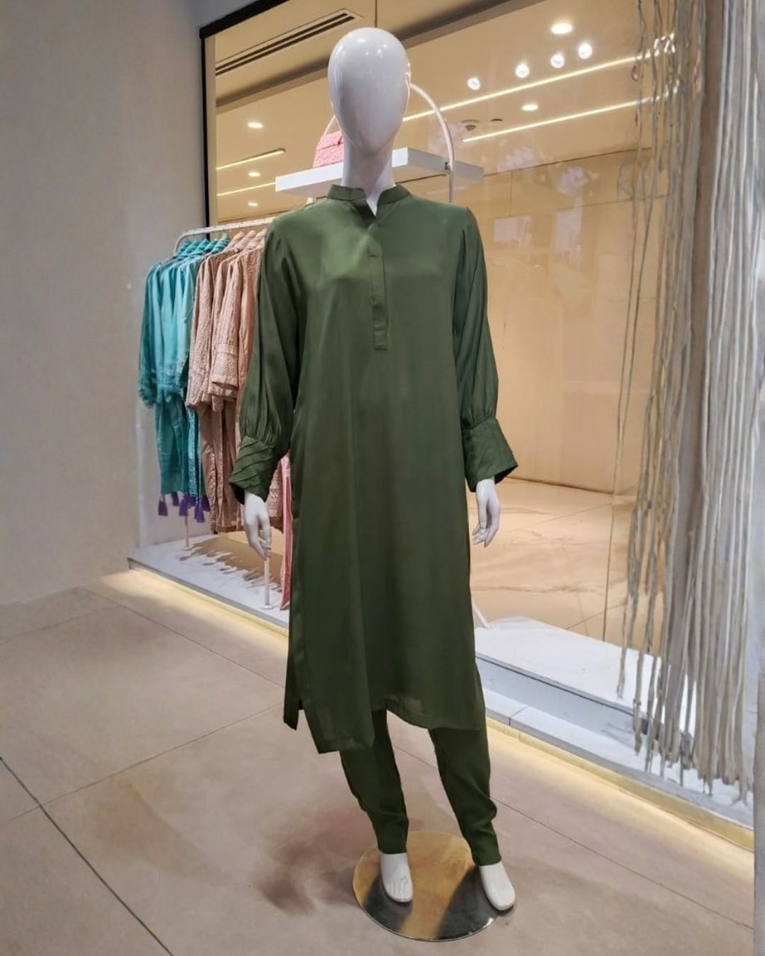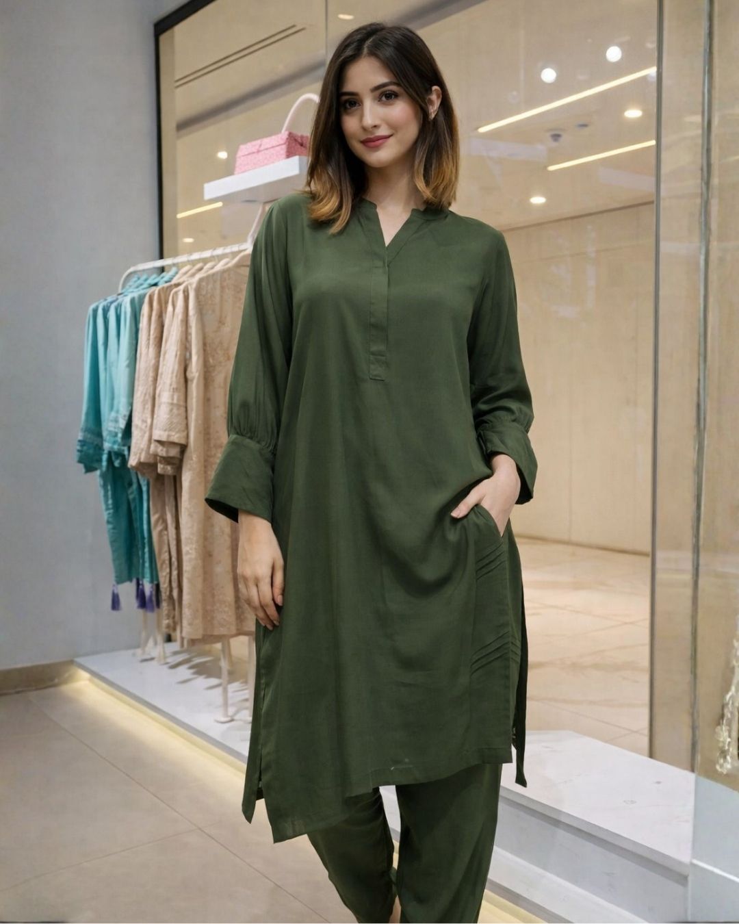 The kurta features a clean, minimalist silhouette with a refined neckline and relaxed sleeves, allowing the rich green hue to take center stage. Its fluid fall enhances movement while maintaining a polished appearance. Paired with straight-cut trousers, the ensemble delivers a balanced look that is both modern and classic, perfect for women who appreciate understated sophistication.