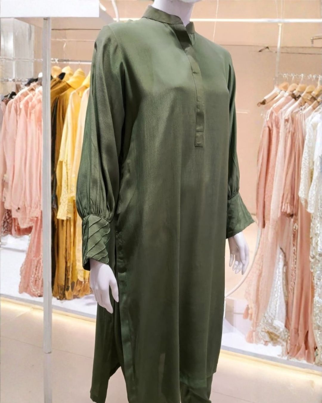 The soft blush hue exudes warmth and refinement, while the silk satin fabric drapes beautifully, catching light with every movement for a subtle, luminous sheen. The long, fluid shirt features a minimalist silhouette adorned with delicate button detailing, paired with wide-leg trousers that offer both comfort and couture-like poise.