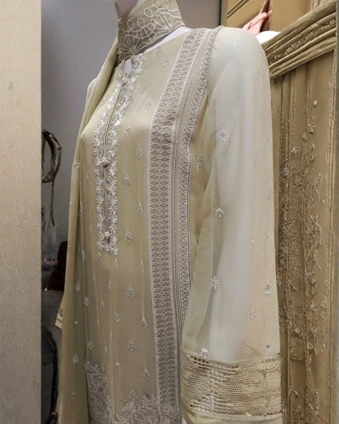 The look is completed with a net embroidered dupatta, flowing like a dream with refined craftsmanship and delicate detailing that elevate its timeless appeal. Paired with a rawsilk inner and trouser, this outfit beautifully balances sheer delicacy with luxurious structure.