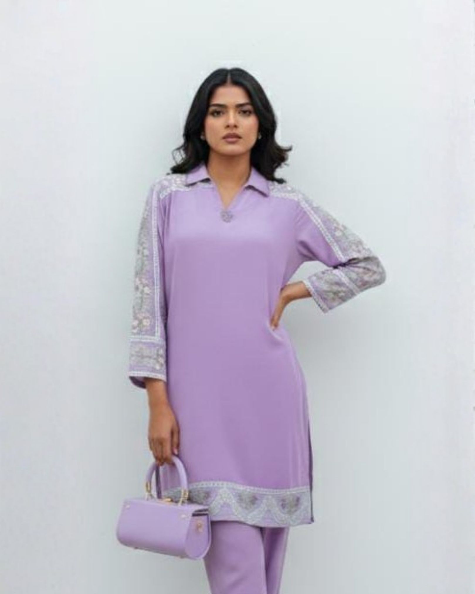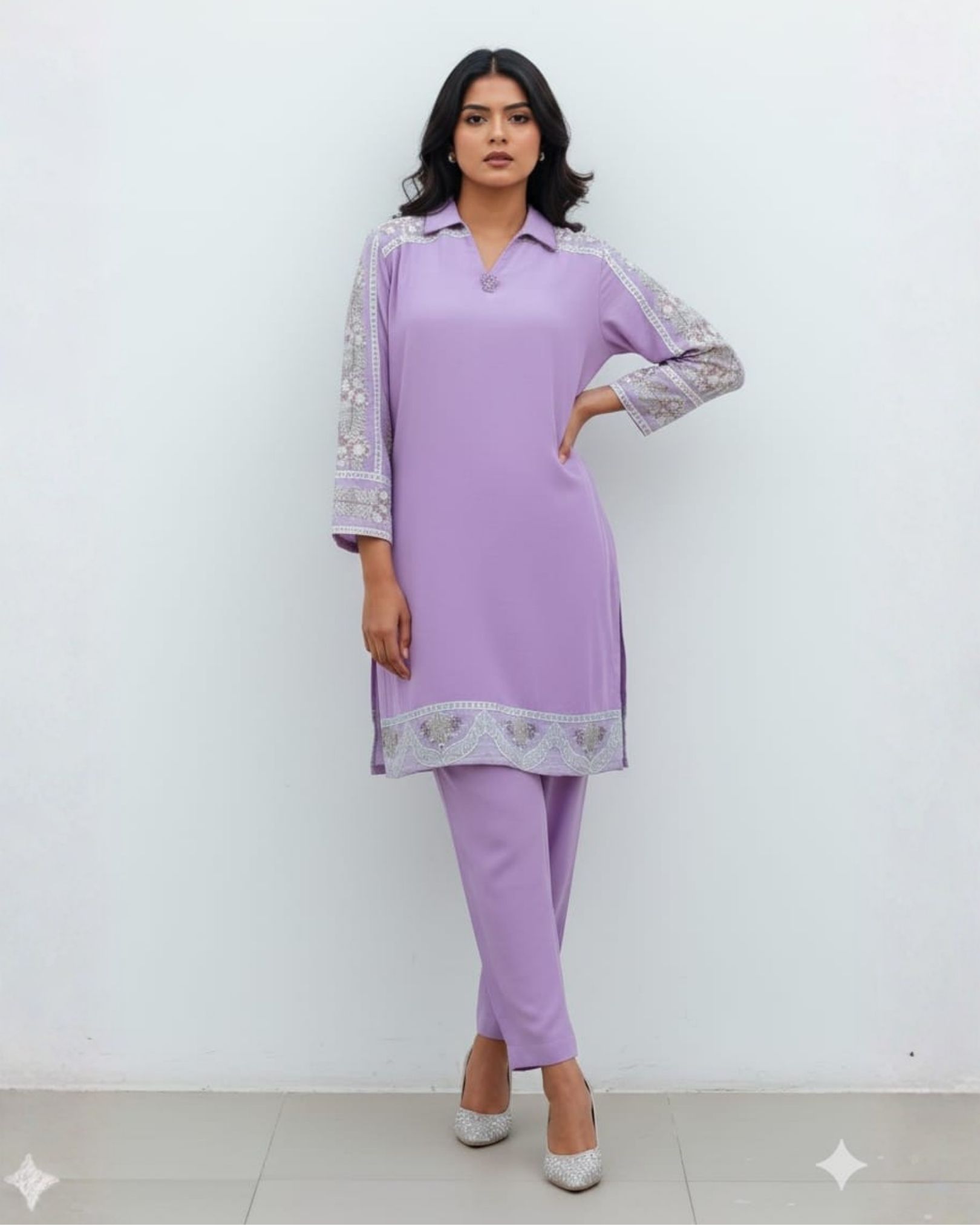 The soft lavender hue radiates femininity and poise, complemented by delicate embroidery and embellishments on the sleeves and hemline, adding a refined touch of sparkle. The collared neckline and sleek straight pants complete the look with a modern, graceful finish.