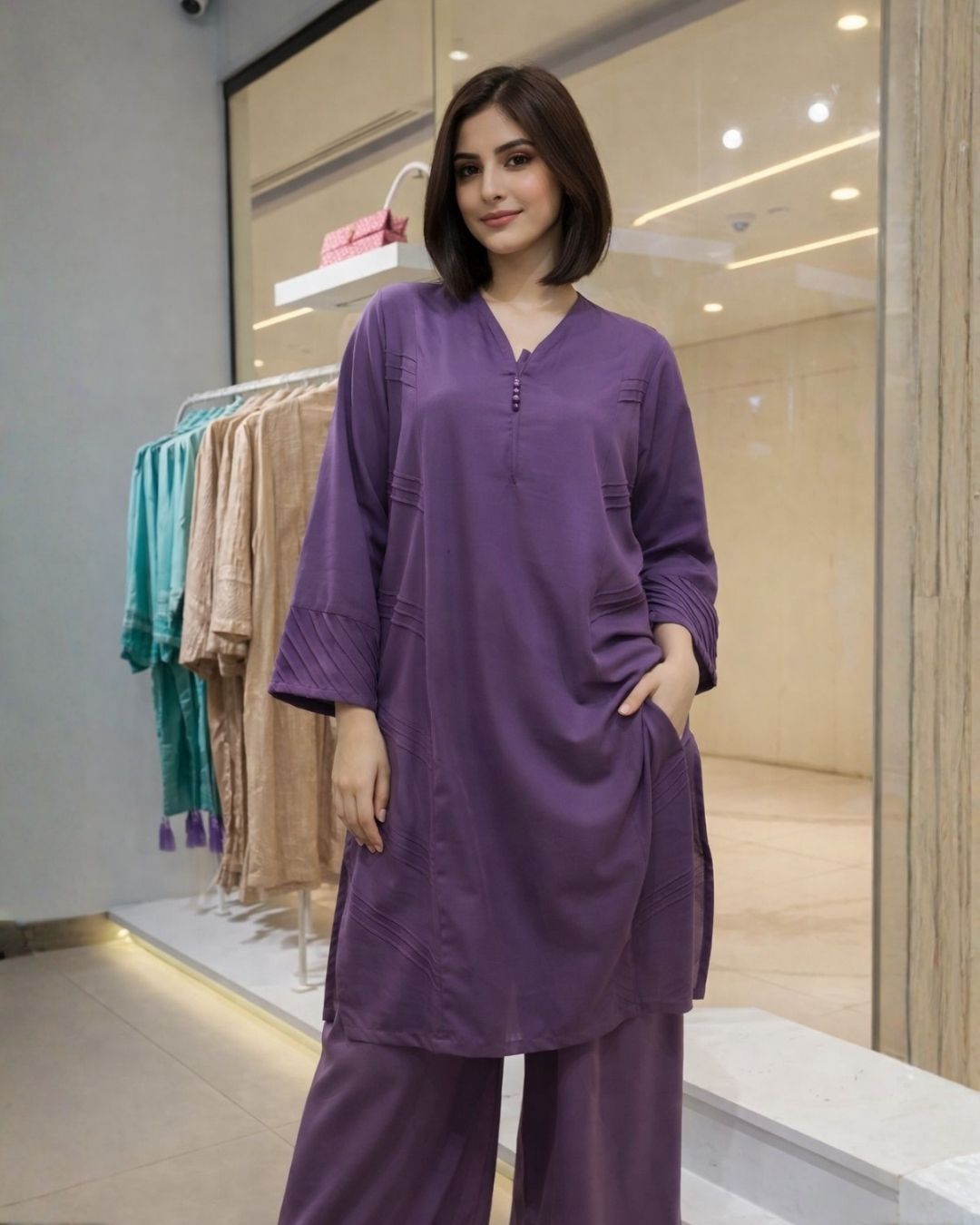 Elevate your everyday winter wardrobe with this Purple Tropical Kharandi 2 Piece outfit, a perfect blend of comfort, understated elegance, and contemporary tailoring. Designed for effortless wear, this ensemble is ideal for women who appreciate clean silhouettes enhanced with subtle design details.