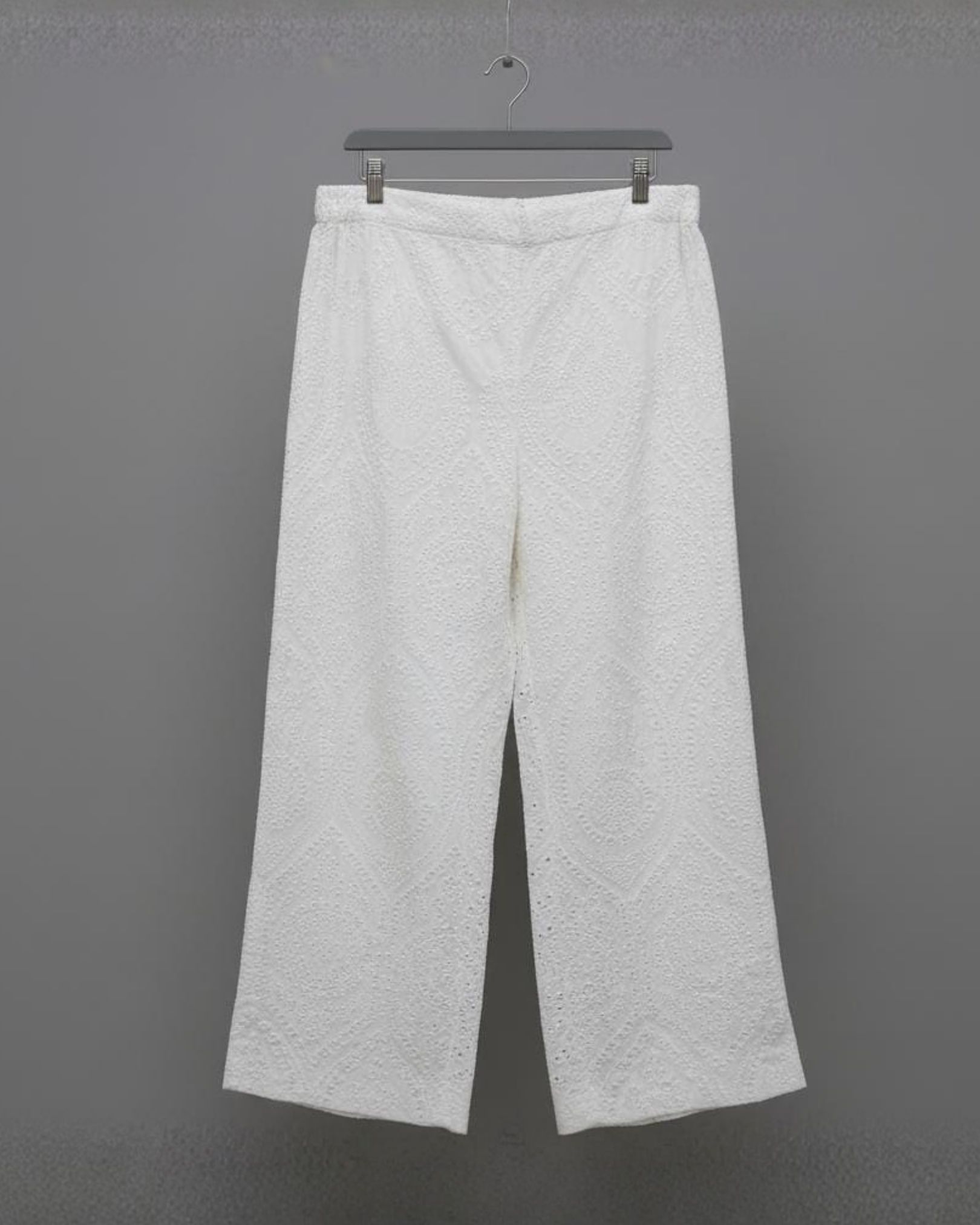 The short, trendy shirt is elevated with tassel button accents, adding a touch of whimsy and refined detailing. Paired with wide-leg trousers featuring intricate lace embellishments, it creates a silhouette that’s both graceful and effortlessly stylish.